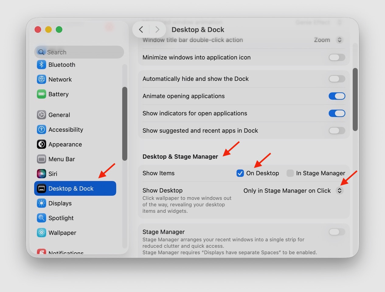 Turn Off Stage Manager to Keep All Windows from flying off Desktop every time you accidently click on the Desktop Wallpaper 1. Go to System Settings > Desktop & Dock > 3. After Show Desktop check 'Only in Stage Mgr on Click'