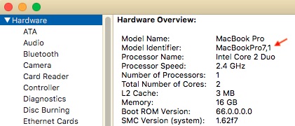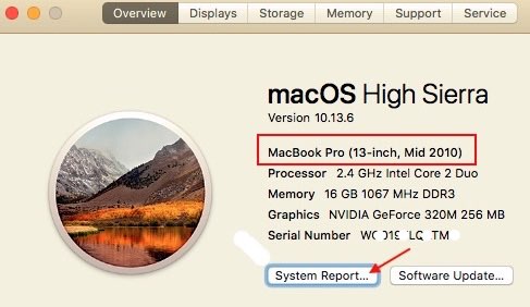 4. Note Model, Screen SIze, Year (Example: MacBook Pro, 13" Mid 2010) 5. Click 'System Report' to find Model Identfier (Example: MacBookPro 7,1)